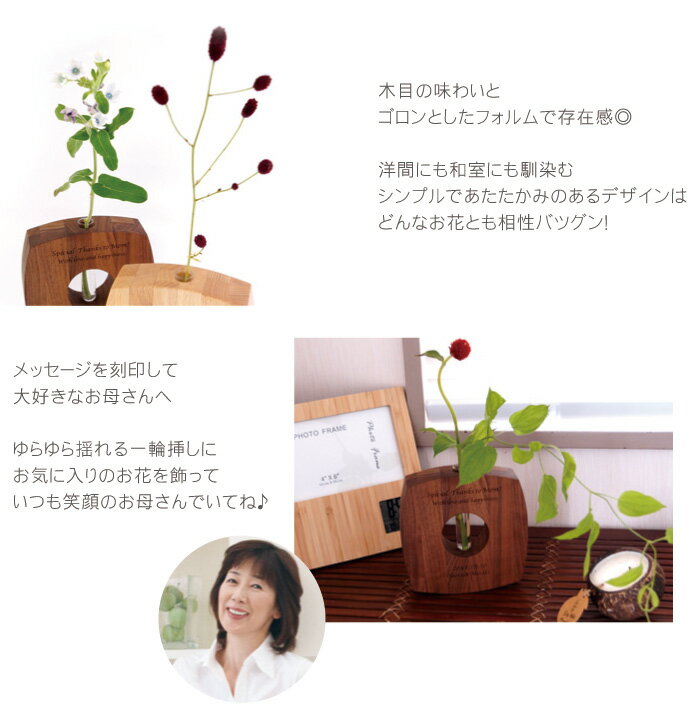 商品情報 【木製ゆらゆら一輪挿し】 お母さんへのお花ギフトに窓辺でゆれるメッセージ 無垢の木目の美しいゴロンと大振りの一輪挿しは インテリアとしても大活躍 どこかレトロな雰囲気も感じさせるおしゃれデザイン ナチュラルなデザインだから 洋花とも和花とも相性があり お庭の野草を飾るのにもおすすめ 窓辺でユラユラ揺れるメッセージは眺めるたびに笑顔になります 木の温もりと心を贈る「木製品専門店 モクゾウ」 仕様 / サイズ ■本体材質: ウォルナット材(ブラウン)、ビーチ材(ナチュラル) ■試験管材質: ガラス ※仕様は予告なく変更する場合がございます。