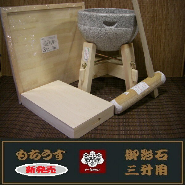 ◎御影石鉢型三升用・外径41センチ、穴径33センチ、高さ23センチ、重量約35kg ◎専用木台(展開時)50×50×高さ36センチ ◎杵Sサイズ、頭部けやき径9×48センチ、柄長90センチ 約3,0kg ◎餅のし板 三方枠 3升用 60×70cm H2,7cm ◎餅箱、スプルス・シナベニア、30×50×高さ7.5センチ