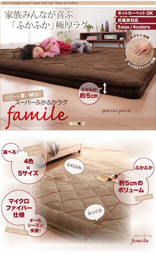 スーパーふかふかラグ famile/ファミレ 90×120 cm【代引不可】 ラグ クッションラグ ウレタン入り 厚み ホットカバー ホットカーペットカバー ホットカーペット 床暖房対応 マイクロファイバーラグ 滑り止め 新生活 ordy